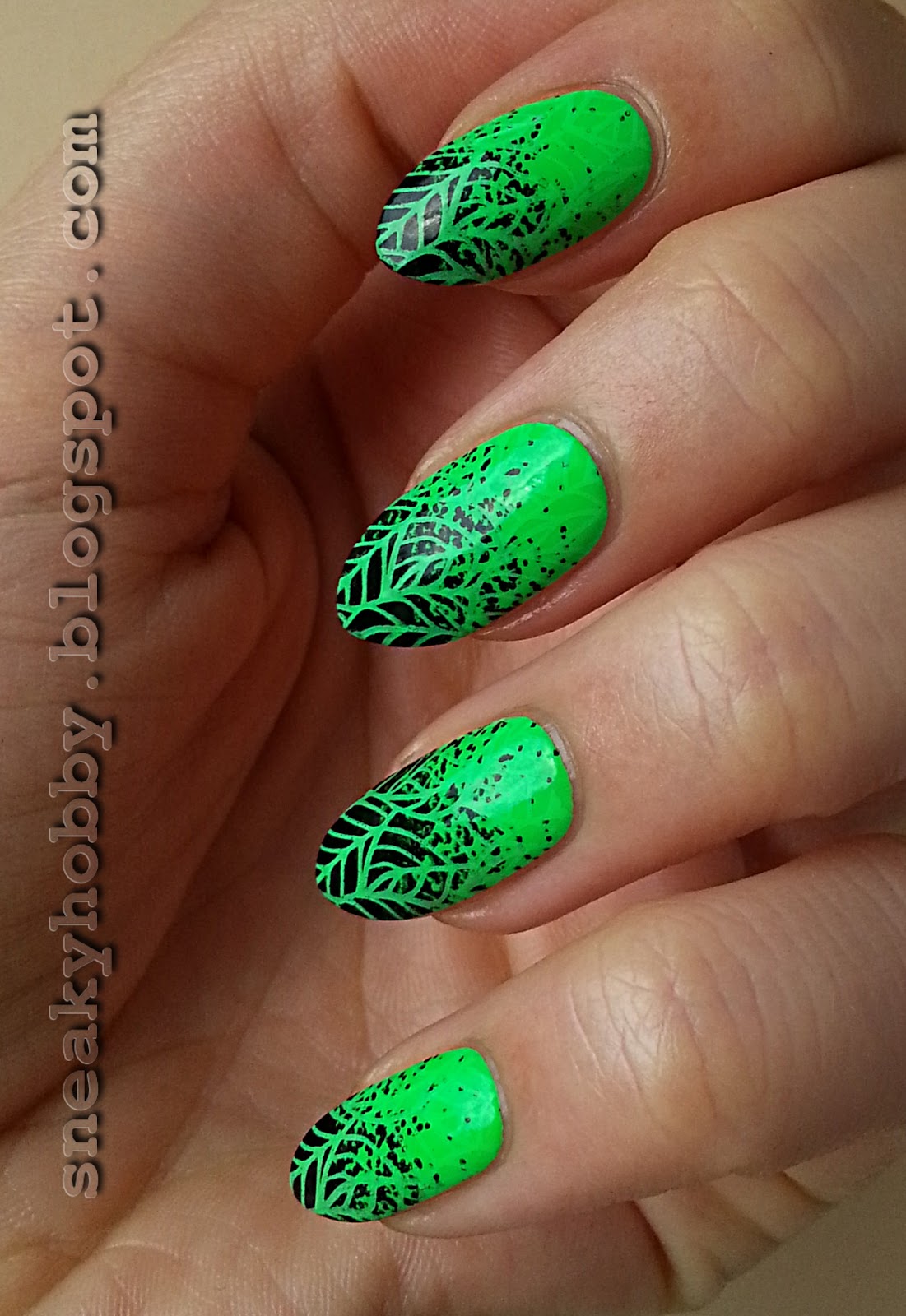 It's time for my last neon manicure made using polishes from Noen Goes Plastic and Neon Power collections. Today it's two greens mixed together in one nail art. I wonder how will You feel about this proposition :>